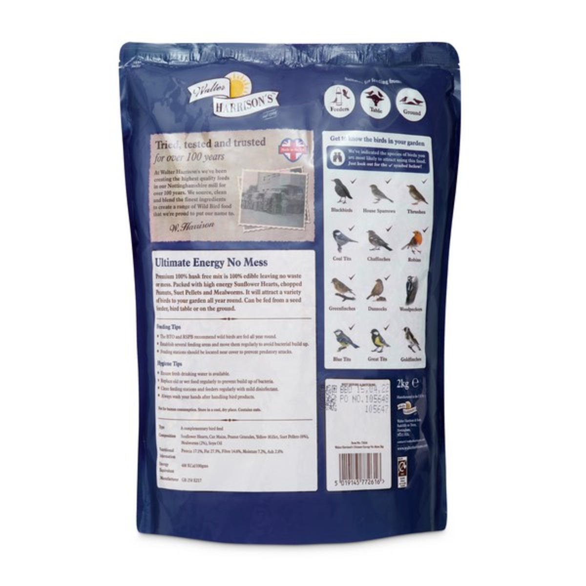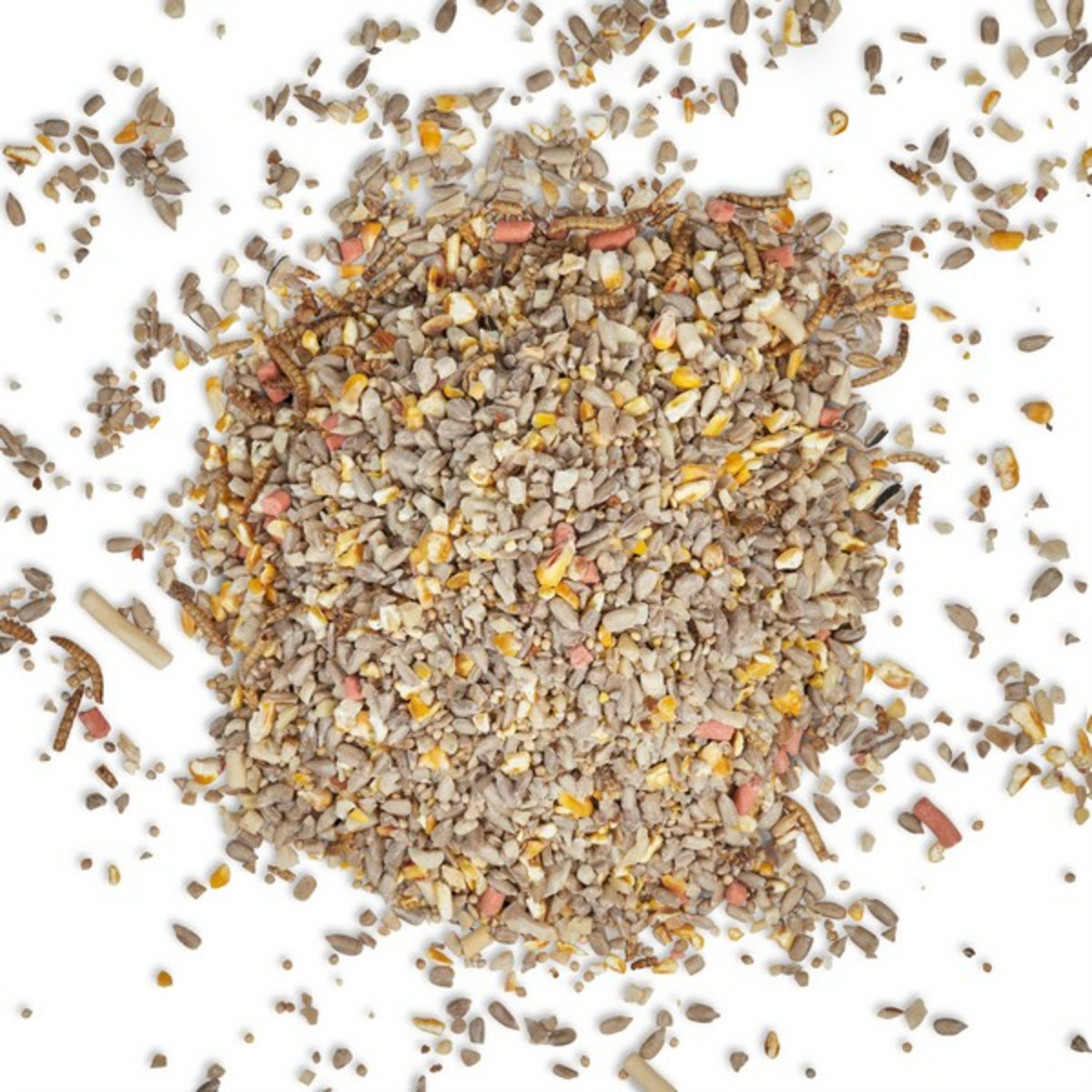Premium 100% husk free mix with energy suet pellets and mealworms, 100% edible leaving no waste or mess. Attracts a variety of birds to the garden all year round. Can be fed from a seed feeder, bird table or on the ground.