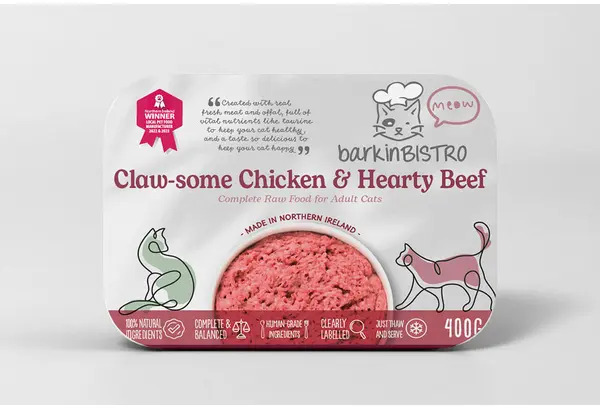 BarkinBISTRO’s Claw-some Chicken & Hearty Beef is nutritionally balanced and complete, fortified with vitamins and minerals including essential taurine, vital for your cat’s health.