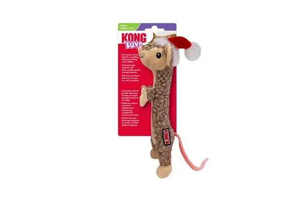 KONGŪ Holiday Cat Luvs Mouse is festively dressed and ready for rounds of active play this season! The long, oversized body is ideal for full-body play, with uniquely textured outer material and an inner crackle that sparks wrestling and hind paw kicking. Easy-to-capture features like its head, feet, and tail make this mouse an ideal contender. KONG Premium North American Catnip inside energizes rounds of solo play. Perfect for snuggling up to when playtime is over.