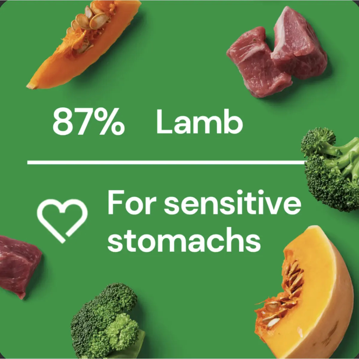 | Ingredients | 87% Lamb (meat, luung, tripe, fat, liver, heart), Chicory, 2.3% Pumpkin, 2.3% Broccoli, Hemp Oilm Salmon Oil, Blueberry, Seeweed. |