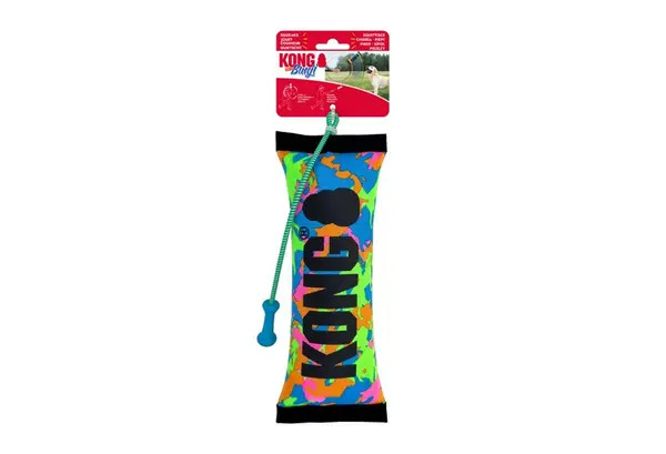 The KONG Bunji High-Viz Bumper is specially designed with bright colours and contrasting patterns for high visibility in various environments, weather, and terrain. Heavy duty firehose material, webbing-sealed edges, and bungee rope makes this toy perfect for energetic fetch-and-retrieve play. The squeaker engages natural instincts during play sessions, while the ergonomic rope & handle design effortlessly launches at long distances, saving your shoulder from burnout! Clean with Damp cloth. This toy should be regularly inspected to ensure there is no damage. If any damage is seen the toy should then be discarded. KONG bright, rope, fetch, play, squeak, natural, play, long