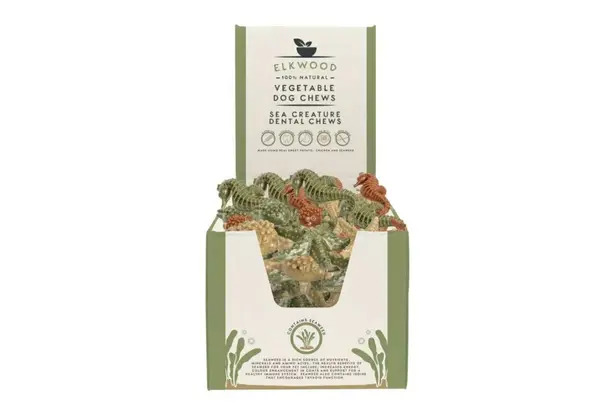 Our Under the Sea Elkwood Veggie Treats veggie formula uses sweet potato and pea flour which makes our treats gluten free. This ensures they are easy to digest, low in fat whilst remaining delicious. Dental chews are a great way to help reduce plaque and clean your dog’s teeth with the grooved edges. Seaweed is a rich source of nutrients, minerals and amino acids. Health benefits for your et of seaweed include; increased energy, colour enhancement in coats and support for a healthy immune system. Seaweed also contains iodine and encourages thyroid function.