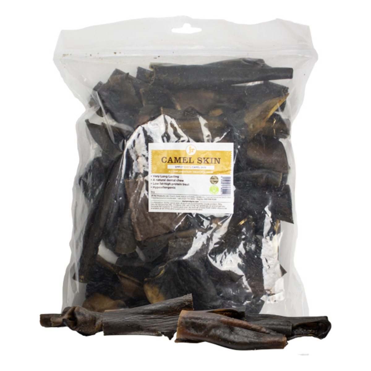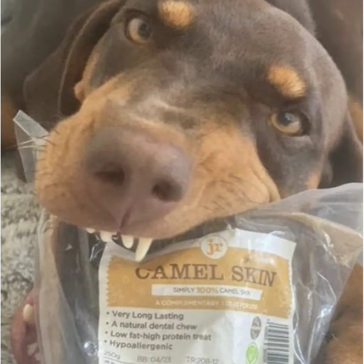 Our Camel Skin Slices are made from 100% Natural Camel Skin. Simply Air-dried with No additives, No Preservatives, Nothing! High in Protein and Low in Fat these chews are tough and longer lasting but smaller than our big 75cm slice so are perfect for small to medium dogs and the more aggressive chewers.