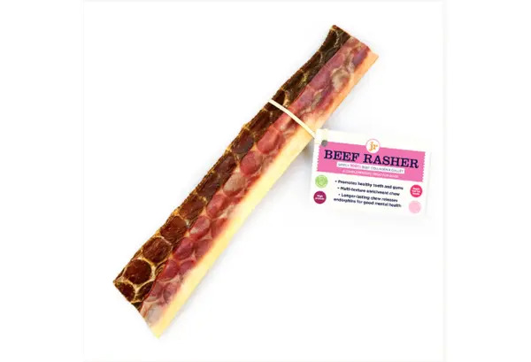 A clever combination of Beef Collagen and Beef Gullet, our Beef Rashers are naturally air-dried to create a tough, long-lasting chew. They’re high in protein, low in fat, and packed with natural Collagen, Glucosamine and Chondroitin to help support healthy teeth, gums, and joints - ideal for dogs of all ages.