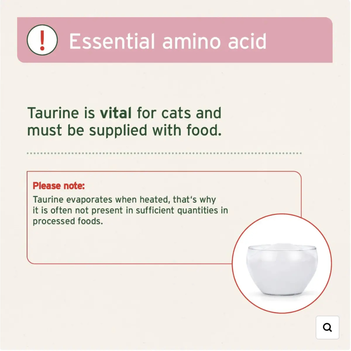 Taurine is an essential amino acid in cats that they can't synthesize in sufficient quantities themselves, so it must be included in a cats' diet. The amino acid plays an important role in the immune system and is necessary for the health of the retina.
