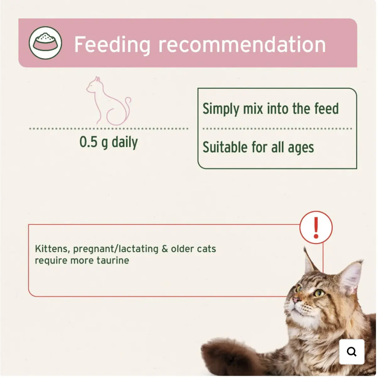 Taurine Powder is an essential amino acid in cats and is vitally important for heart muscle function, vision, digestion and to maintain a healthy immune system. Taurine should be included in a cats' diet as it can't be synthesized in the body. It can act as nutritional support in cases of muscle tremors and nerve ailments. The addition of Taurine Powder to your cat’s diet can also play a role in muscle maintenance and performance.