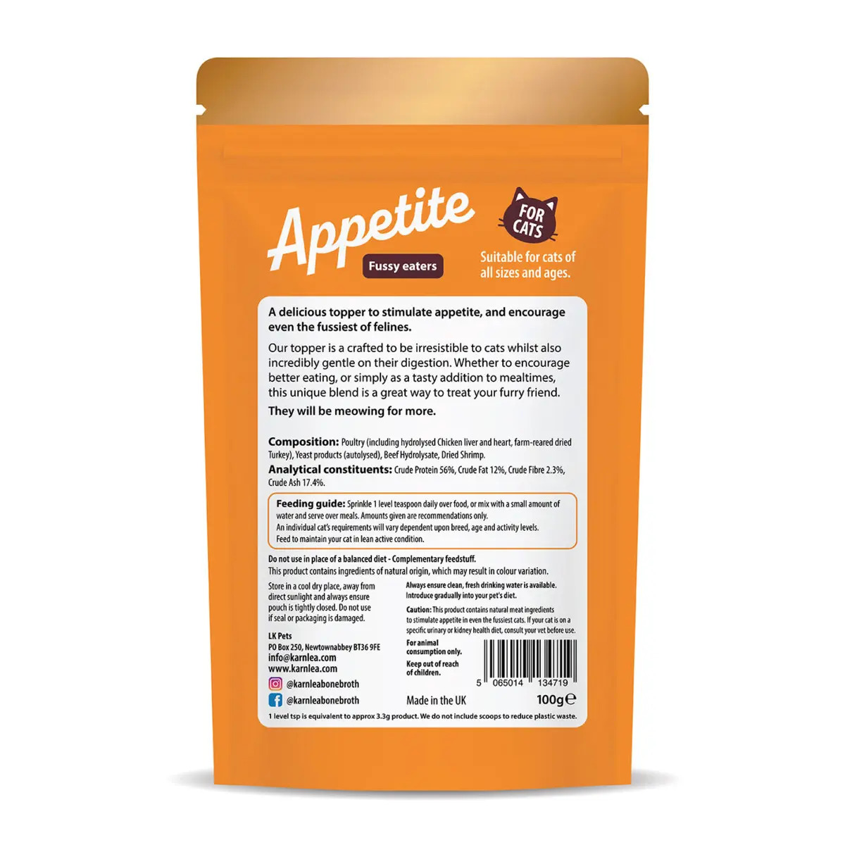 Appetite – Supplement topper to enhance food enjoyment and stimulate appetite in fussy cats or poor eaters. Our carefully formulated supplemental topper is designed for extreme palatability to encourage cats who struggle to eat, are fussy, have lost appetite or generally as a nutritious treat to benefit each meal time. Formulated to be extremely palatable, and have an intense tempting aroma, it can be mixed into food, added as a topper, or mixed with a little liquid to create a gravy.