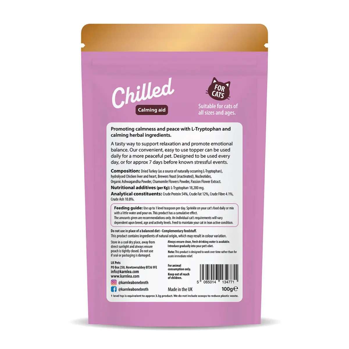 Chilled – Our carefully formulated calming supplement, is a daily use, cumulative effect product promoting calmness and peace with L-Tryptophan and calming herbal ingredients. Formulated to be extremely palatable, our convenient, easy to use supplement topper can be used for a more peaceful pet. Designed to be used every day or for approx 7 days before known stressful events.
